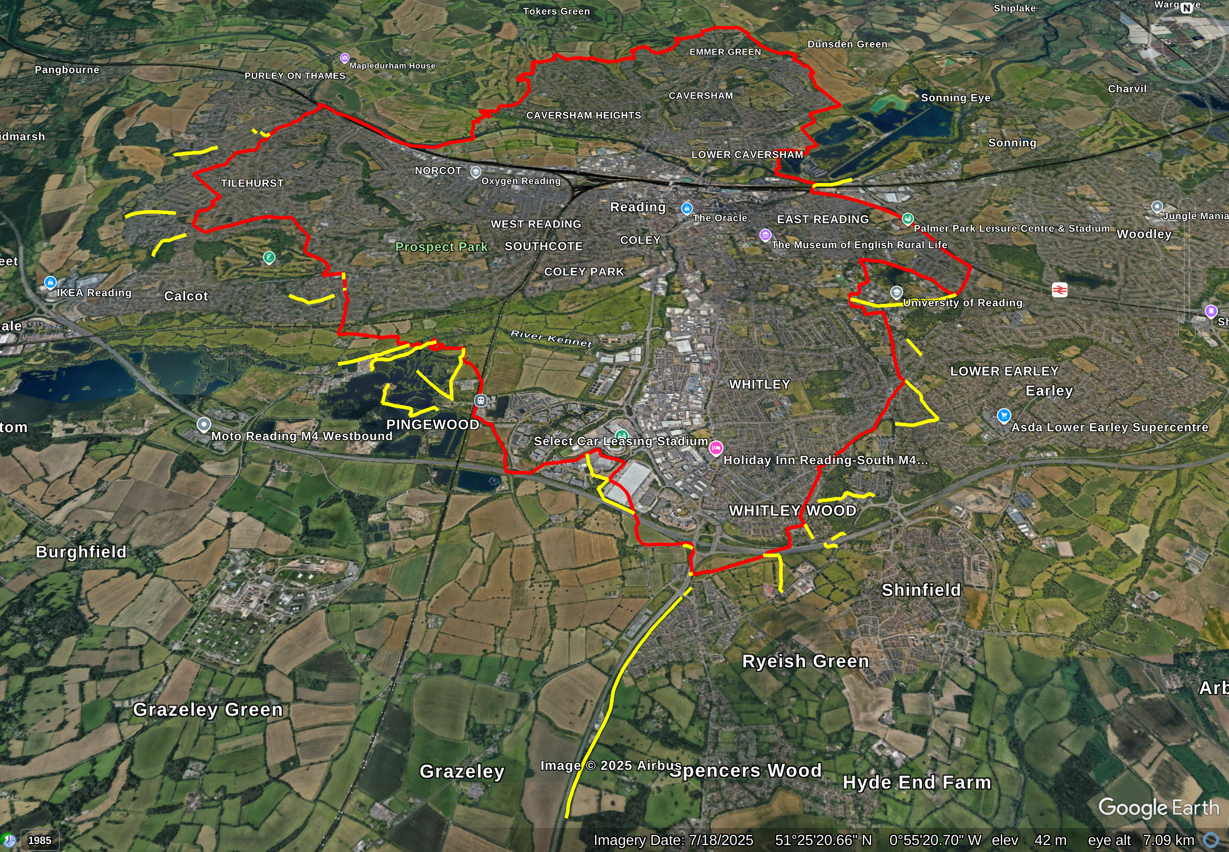 In October 2025, BC reported to me that the council's data has public rights of way that are outside Reading. On investigating, I found that there were 39 public rights of way that are outside Reading. In the council's data, these public rights of way have a PAR_NAME that is not READING. Here is a list of PAR_NAMEs that are used together with the number of paths that have that PAR_NAME: BURGHFIELD 10, EARLEY 5, SHINFIELD 13, THEALE 4 and TILEHURST 7. This screenshot shows GoogleEarth with the boundary of Reading (in red) and the paths (in yellow) that have a PAR_NAME that is not READING. My thanks to the Ordnance Survey as the boundary for Reading has been produced using their Boundary-Line product.